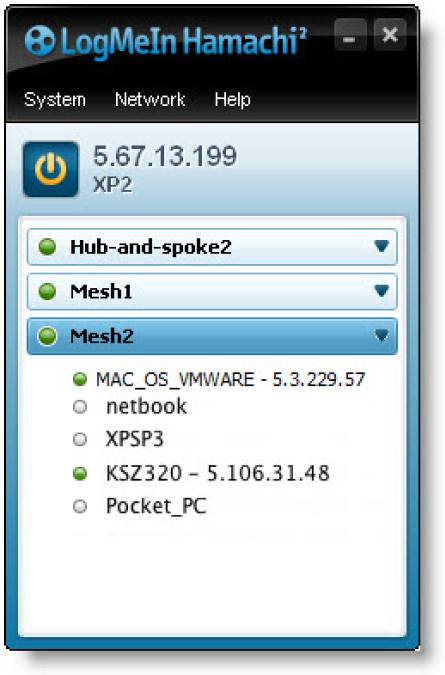 Разработчик: LogMeIn, Inc. Версия: 2.0.3.89 (можт не совпадть, если не совпала, можно обновить) Системные требования: Windows XP/2003/Vista/7 Описание: Hamachi - программа для создания прямого соединения между двумя компьютерами через интернет. Созданная виртуальная сеть будет поддерживать практически все возможности обычной локальной сети, включая предоставление общего доступа к файлам (в этом случае на машинах должна быть настроена локальная сеть) и сетевые игры, запускать web или ftp серверы. Причем этому не помешают ни установленные файрволы, ни роутеры.